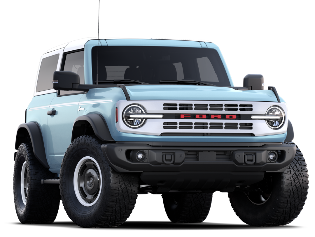 Choose the Heritage Limited Edition Ford Bronco for an Oxford White-painted hard top, a HOSS 2.0 System with Bilstein PSDs and high clearance ride height, and unique floor liners. The same red "FORD" lettering with a white-painted grille is out front, and a Heritage Limited Edition bodyside graphic is included.