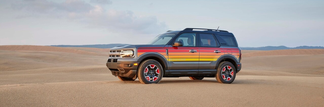 The 2025 Ford Bronco features a retro-styled Free Wheeling trim, featuring 1970s-inspired multi-color stripes on the body side. Further, the available Sasquatuch off-road package features high-clearance fender flares with upgraded Bilstein® shocks, mud-terrain tires, and a raised suspension.